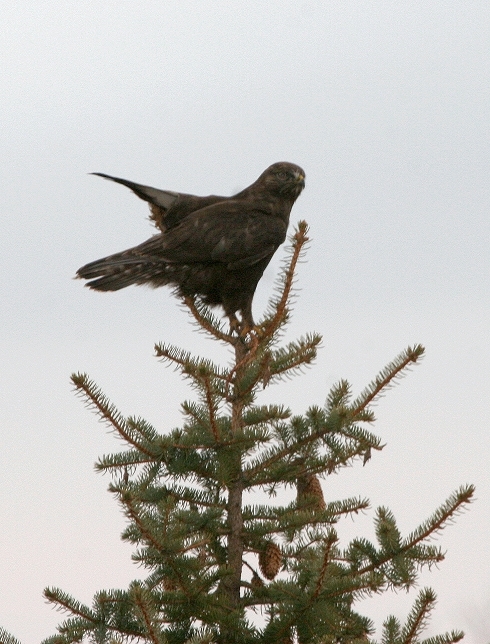Below: A dark-phase Rough-legged Hawk perched by the roadside in central Indiana (12/28/2005).