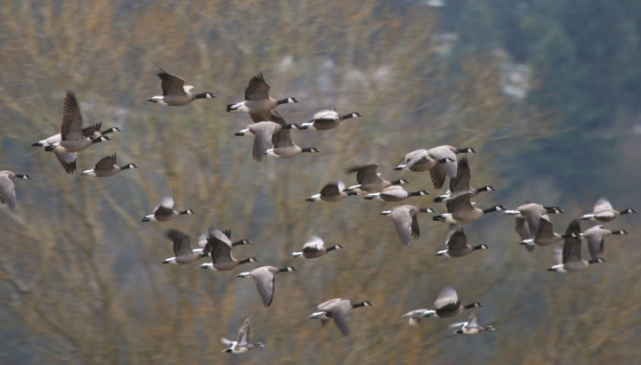 Below: Mixed flock of Canada and Cackling Geese, with two American Wigeon, in flight.