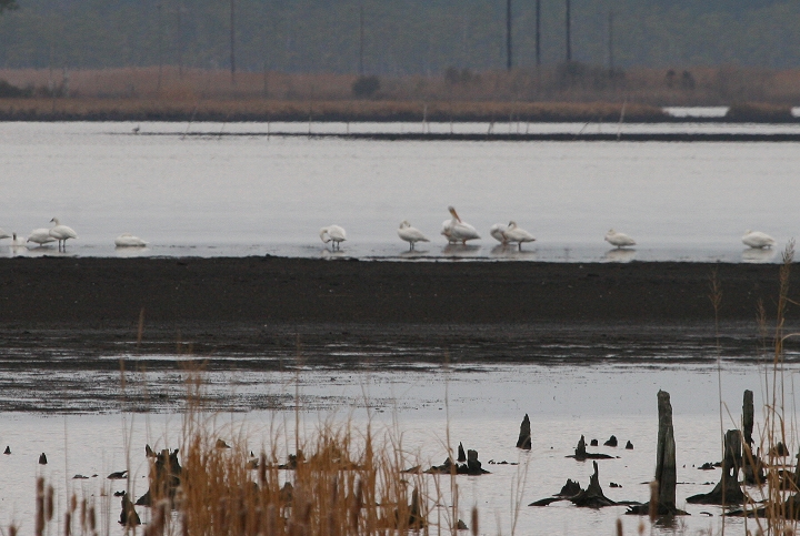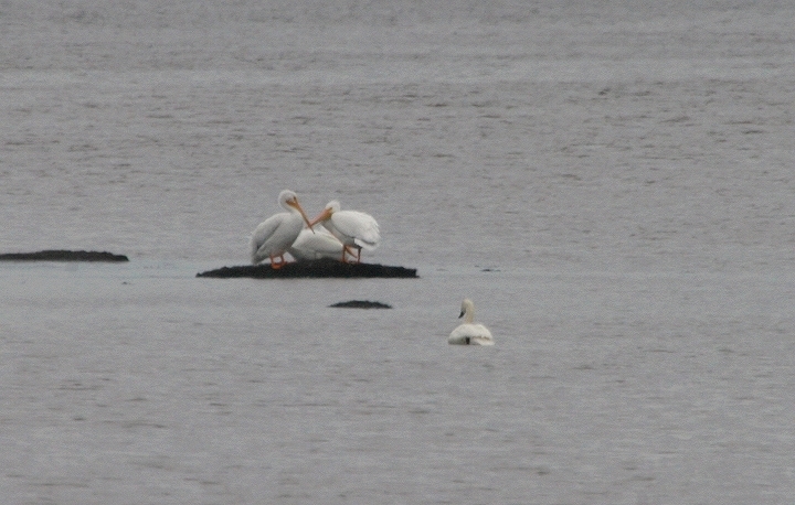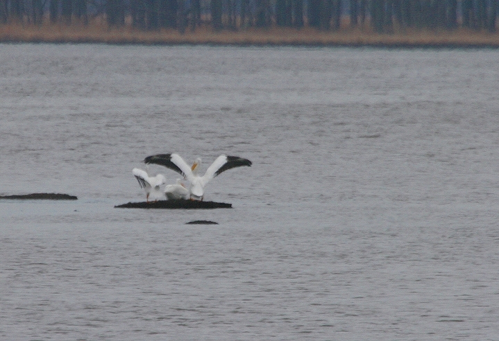 Below three: Three American White Pelicans in the distance at Blackwater NWR, Maryland (1/29/2006).