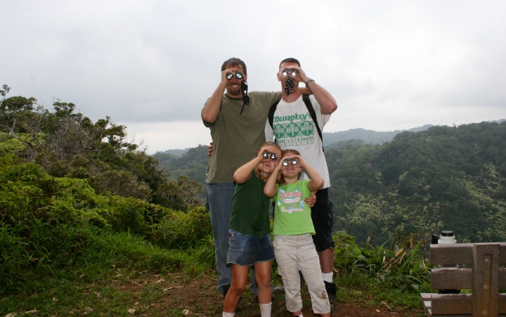 Below: Hiking and bird-watching with O'ahu's own Robey family - Jody and new birders Kristin (left) and Katelynn (right). Katelynn's going to open a zoo, and has informed her mom and dad that they will work for her. Photo by Stephanie Robey.