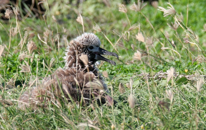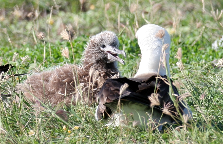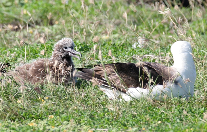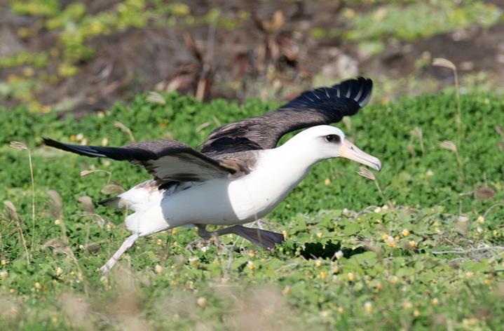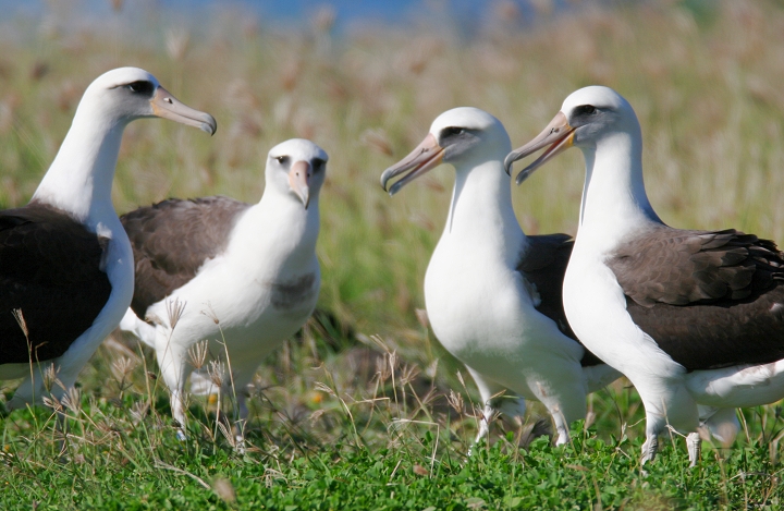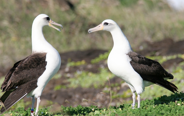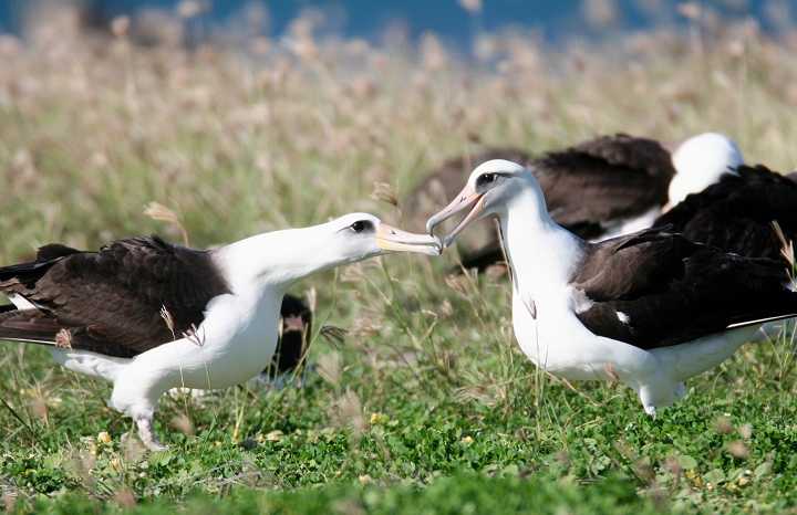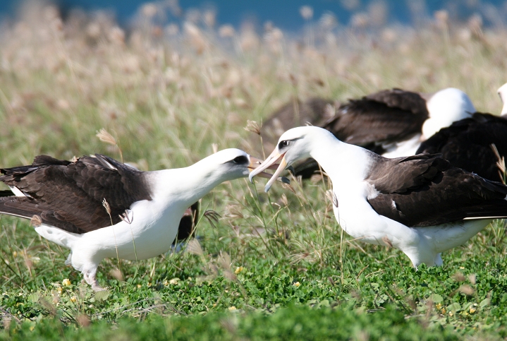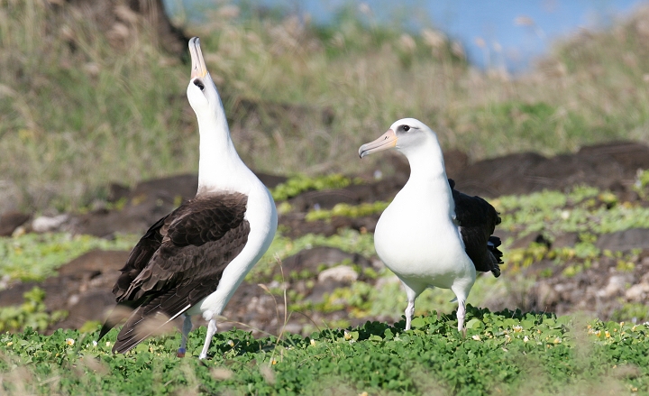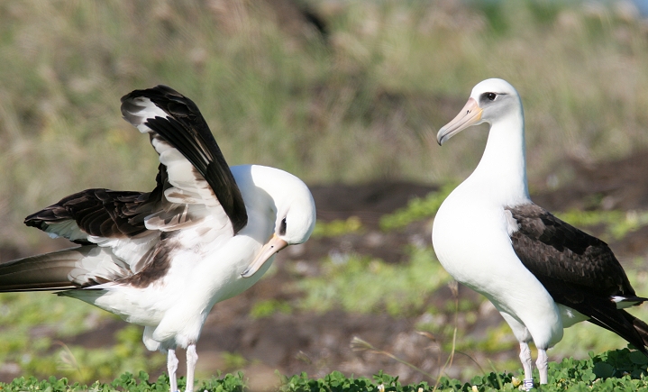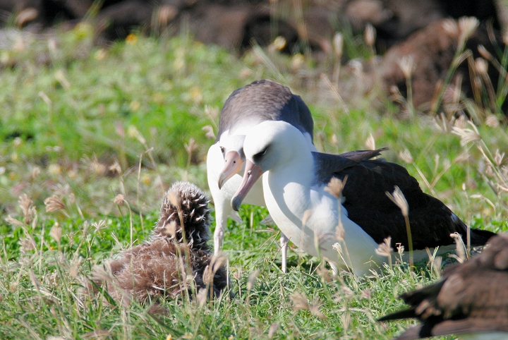 Above and below thirteen: Becky and I were absolutely blown away today to watch about 28 Laysan Albatrosses at Kaena Point, O'ahu. We were speechless and delighted, as this was truly one of the most wonderful natural events we've ever seen! The group included at least one adorable chick, which the entire group seemed to fawn over. For those of you new to albatrosses, these beautiful seabirds have wingspans up to 7 feet, and engage in ritualized dancing on the breeding grounds. (3/20/2006)