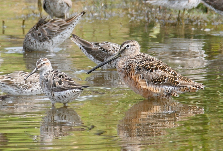 Below: A Long-billed Dowitcher (right) and Stilt Sandpiper (left). This flock consisted of at least 30 Stilt Sandpipers. As Central Flyway migrants, these species are much more common here than in the East.