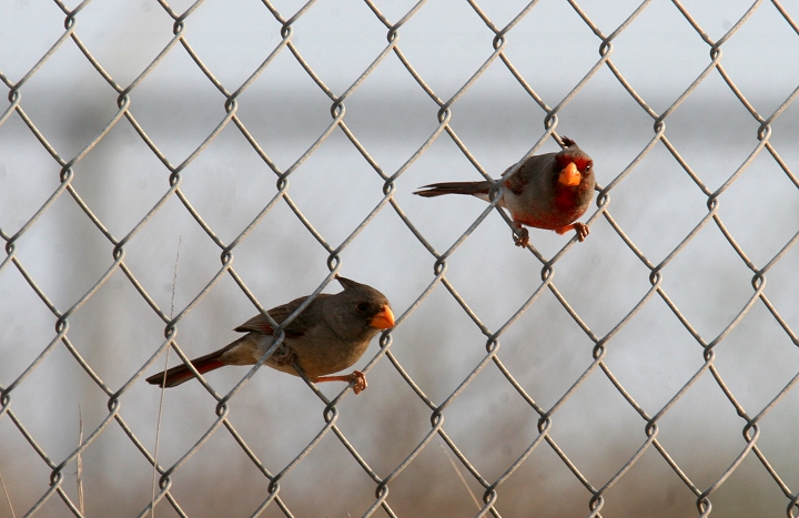 Below: A pair of Pyrrhuloxia, desert relatives the cardinal.