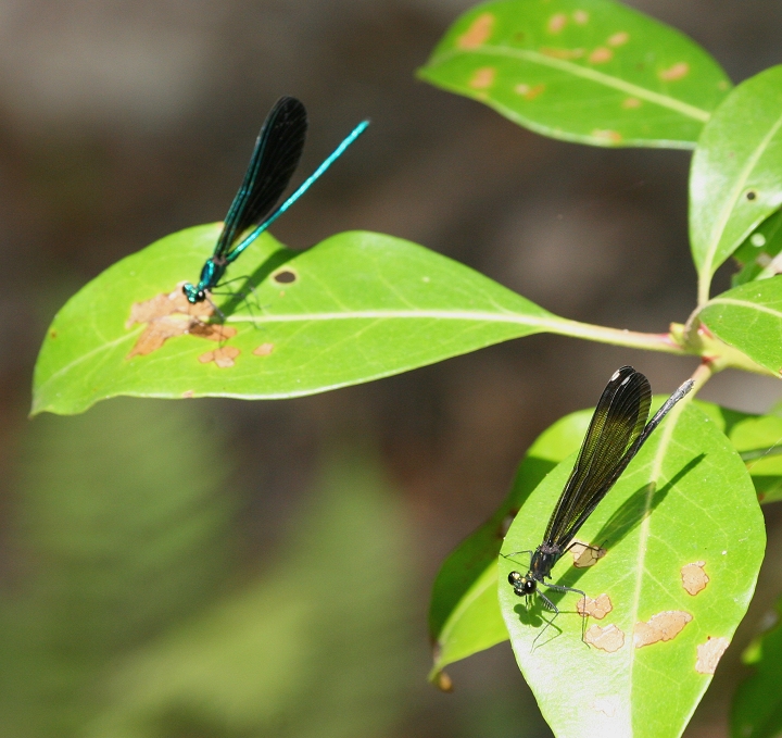 Below: A pair of Ebony Jewelwings in Charles Co., Maryland (7/15/2006). The male shown in back is a much brighter green, while the female, at front, is tinted brown with white pseudostigmas.