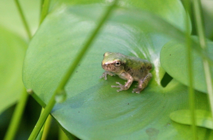 Above: A Broad-headed Skink in Charles Co., Maryland (7/9/2006). This beauty was about 12" long (4" longer than your largest adult Five-lined), and fled to over 20' in a tree. Five-lineds are almost completely terrestrial and should not venture far above the lowest reaches of the trunk. Below: What I'm 99% sure is a young Upland Chorus Frog in Charles Co., Maryland (7/9/2006).