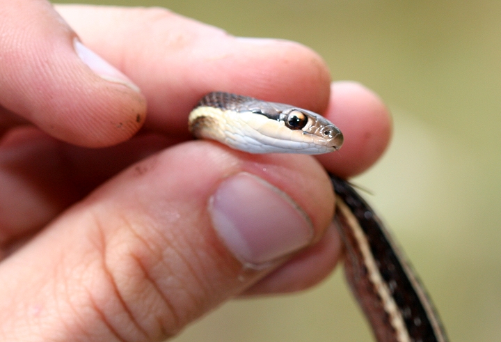Below: An Eastern Ribbon Snake in lower Dorchester Co., Maryland (9/30/2006). Note the snake's narrow head and especially the white area in front of the eye. Ribbon Snakes also have thinner bodies, longer tails (1/3 vice 1/4 or less of body length), and a slightly different stripe pattern.