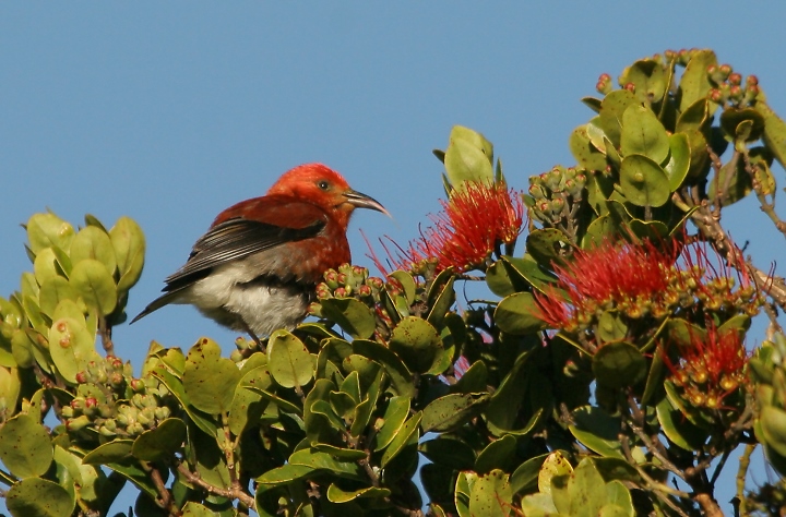 Below: An Apapane nectars on O'hia Lehua in Kokee SP, Kauai (2/10/2007).