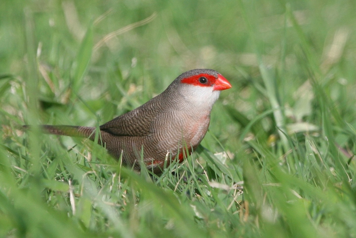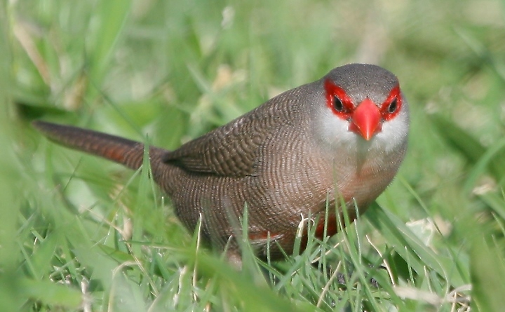 Below: An adult Common Waxbill feeding on grass seeds on O'ahu (2/5/2007).