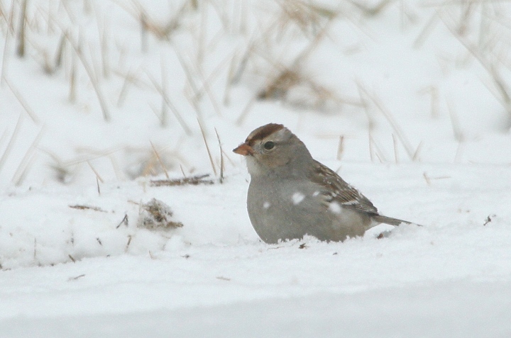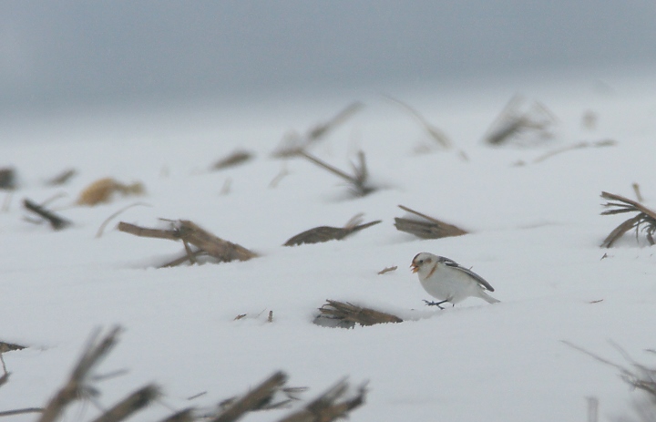 Below: A Snow Bunting is caught appearing to have too much fun in snow-covered Talbot Co., Maryland (2/25/2007). This bird was found along Lewistown Road with several hundred Horned Larks and one Lapland Longspur.