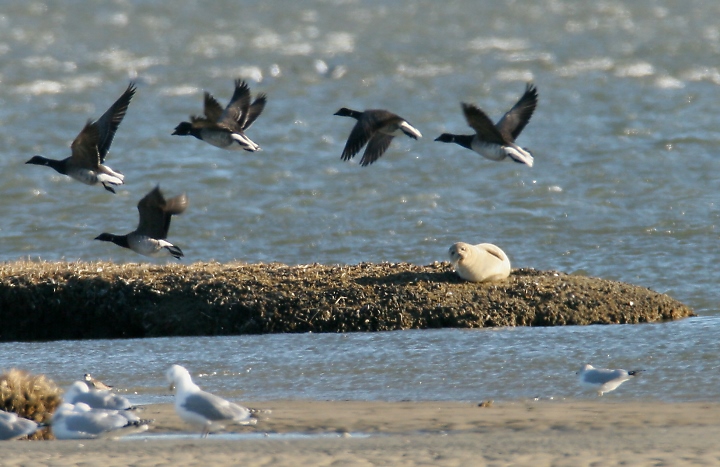Below: A Harbor Seal warms up in the morning sun as a flock of Brant lift off. Near Skimmer Island, Maryland (2/24/2007). I've only seen Harbor Seals in Maryland three times, and very interestingly, my first was at this location exactly one year before this date! We also had several at the Ocean City Inlet about a week later last year. A check of previous reports shows spotty sightings in the Ocean City area between December and March.