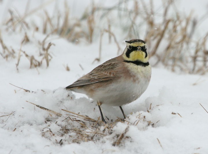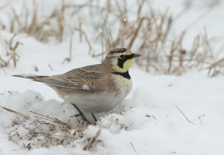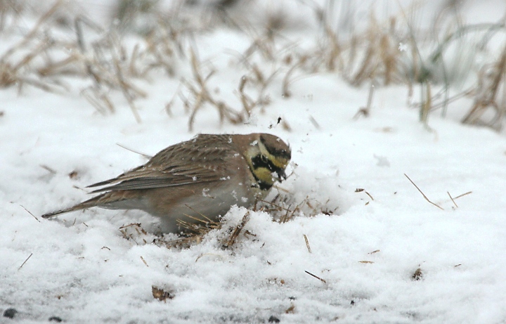 Below: A Horned Lark in Kent Co., Maryland (2/25/2007). Third photo shows roadside foraging action.