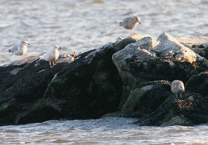 Below: Second-winter Iceland Gull (2nd from left) with Herring Gulls on the jetty at the Ocean City Inlet, Maryland (2/23/2007).