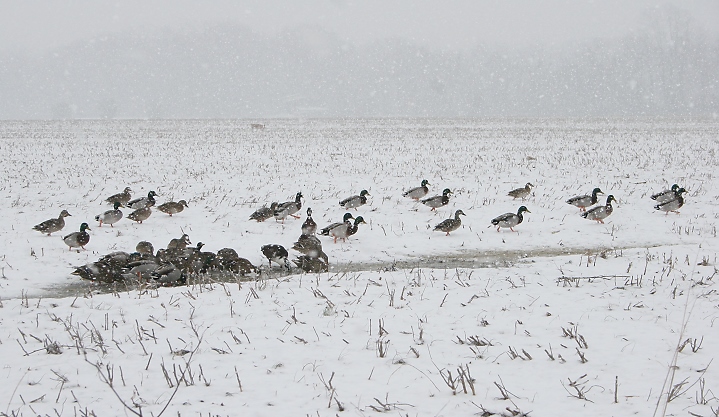 Below: A hungry Mallard flock roaming the snowy fields of Kent Co., Maryland (2/25/2007).