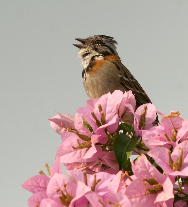 Below: A Rufous-collared Sparrow, the most common and widespread Costa Rican sparrow, sings his heart out at dusk.