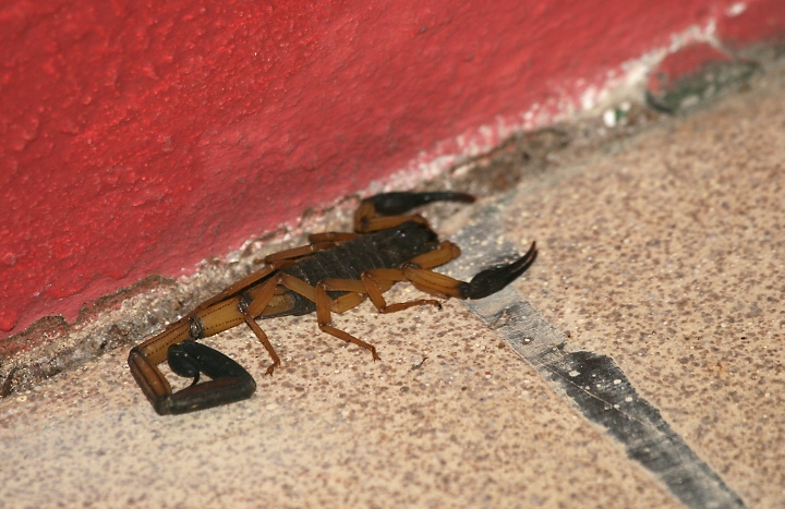 Below: Some neighbors were slightly less pleasant, such as this 4" scorpion we found next to my bed on our way back from checking out the 5" treefrog in our toilet.