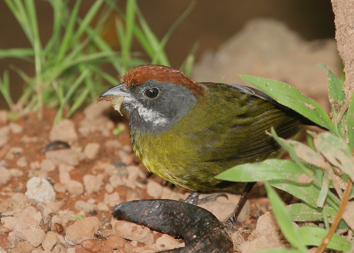 Below: A Sooty-faced Finch feeds on old bananas near La Paz.