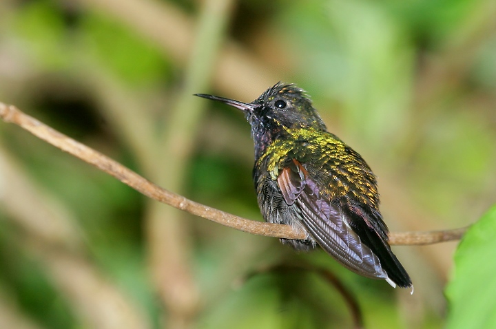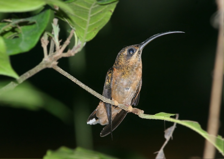 Below: A Stripe-throated Hermit (formerly Little Hermit) feeding near our afternoon cerveza stop on the Osa. It's long tail feathers aren't visible in this image as the bird was constantly pumping its tail.