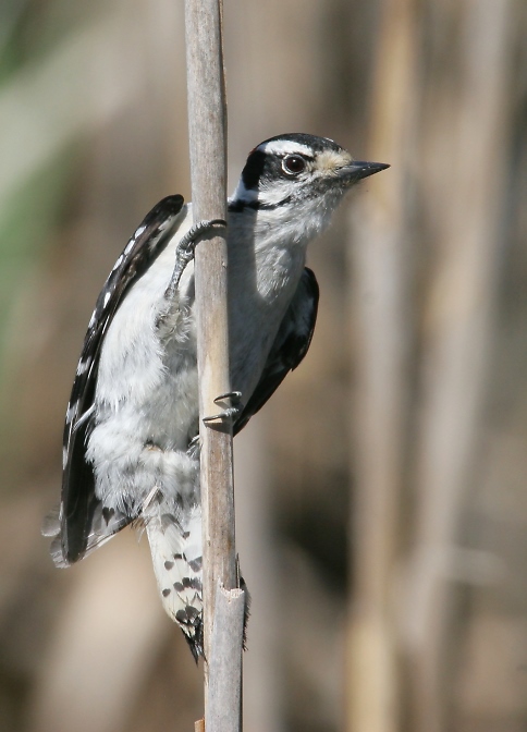 Below: I was surprised to find this female Downy Woodpecker feeding on the narrow stalk of a cattail. Frederick Co., Maryland (4/22/2007).