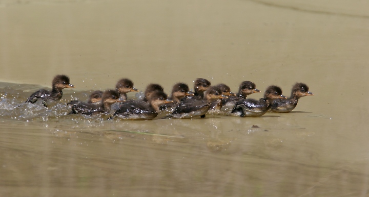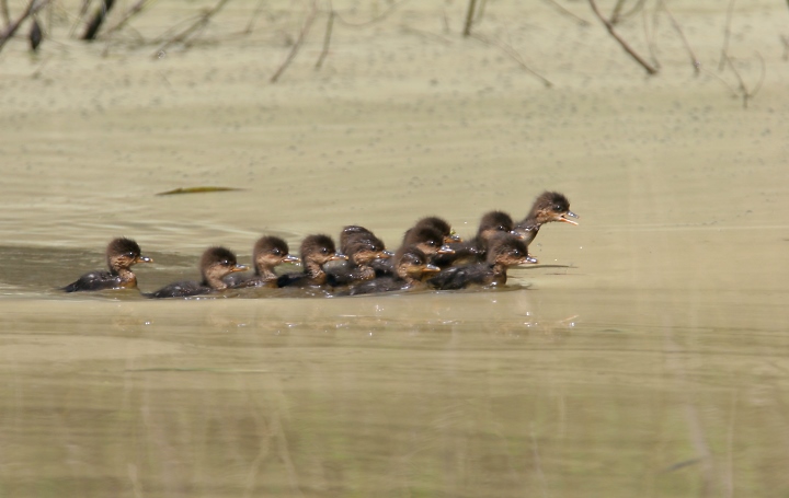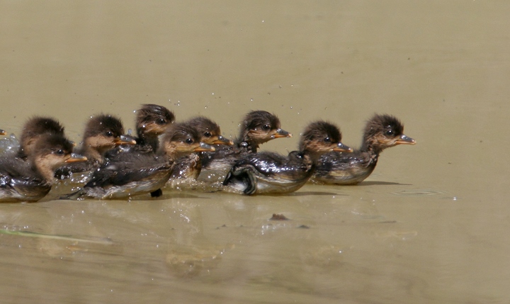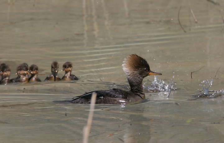 Below three: OK, cuteness warning... Recently hatched Hooded Mergansers race to their mother's protection as we approach a quiet pond in Frederick Co., Maryland (4/22/2007).