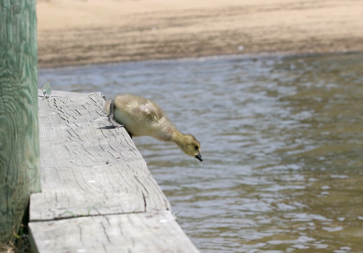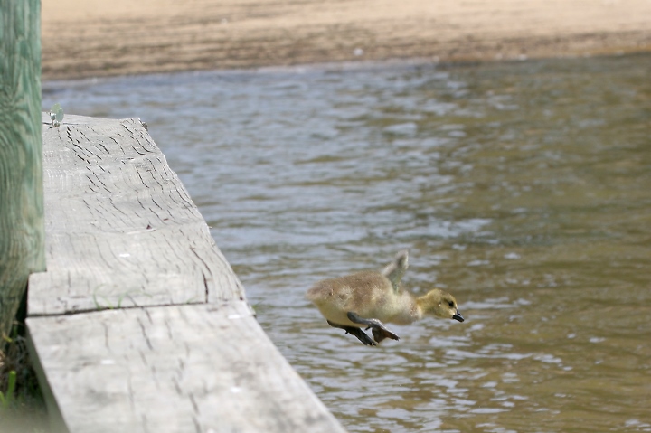Above and below: A Canada Goose gosling braves a monumental leap to follow its parents, Pasadena area, Maryland (5/16/2007). Weeeeeeeee!