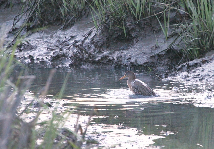 Below: A Clapper Rail bathes in a canal at dusk at Jake's Landing, New Jersey (5/10/2007).