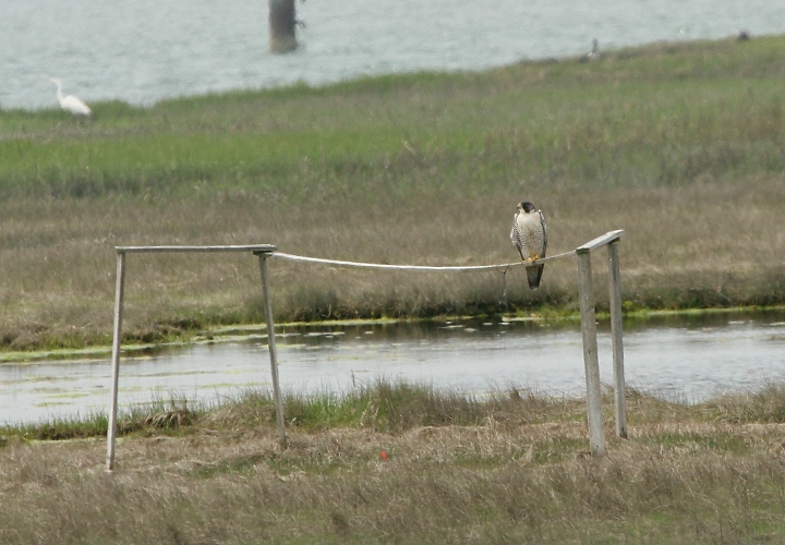 Below: Nummy Island's famous Peregrine finally smiled upon the MOS Yellowthroats, hiding just poorly enough to be detected on the open marsh by teammate Zach Baer (5/10/2007). (This shot was taken during scouting.)