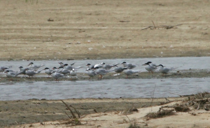 Below: OK, I hate to post bad photos, but it is a Roseate Tern after all - fourth from right, in foreground, The Meadows, Cape May Co., NJ (5/12/2007). The scope views of this beautiful species were phenomenal--too bad I didn't bring the 600mm lens.