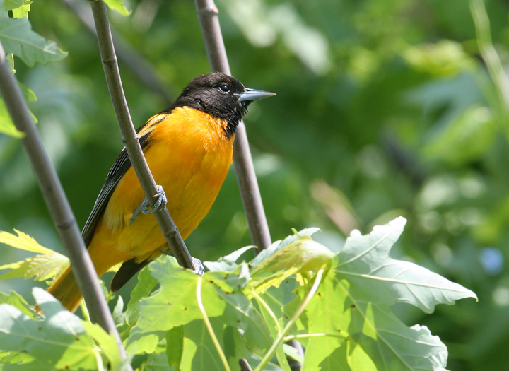Below: A male Baltimore Oriole excitedly guards his domain in Frederick Co., Maryland (5/20/2007).