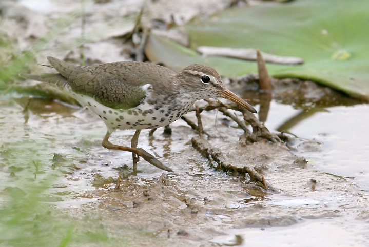 Below: A Spotted Sandpiper forages along a pond edge in Frederick Co., Maryland (5/20/2007).
