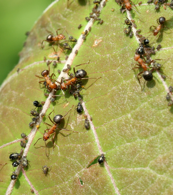 Below: Another day of hard work tending the cattle on this quiet farming leaf. Hans Holbrook found this interesting colony of ants and aphids in Carroll Co., Maryland (6/17/2007). OK, who's a bigger nerd than us? Ant and aphid ID help?