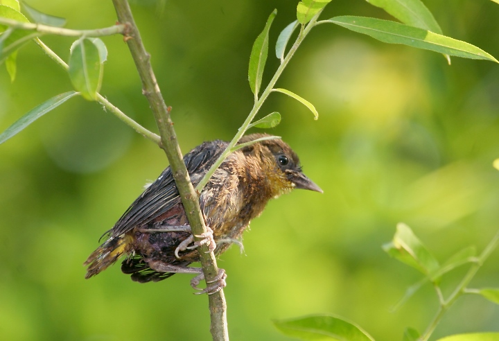 Below: A nestling Baltimore Oriole venturing outside of its nest too early, concerned parent nearby (6/17/2007).