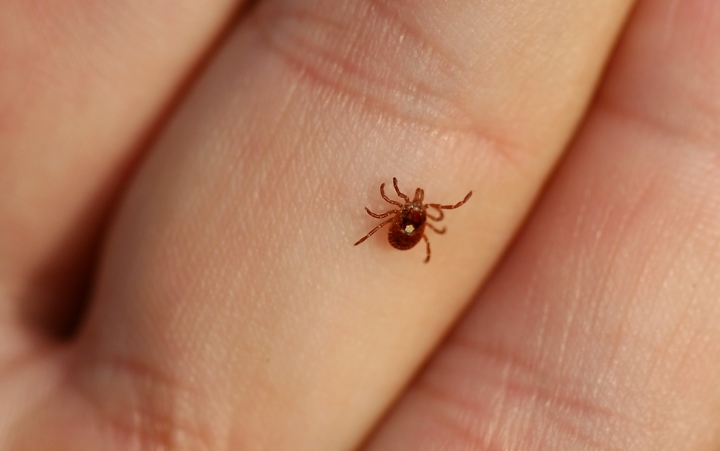 Below: Featured creepy crawly - a Lone Star Tick (Amblyomma americanum) in Wicomico Co., Maryland (7/27/2007). The white dot is diagnostic.
