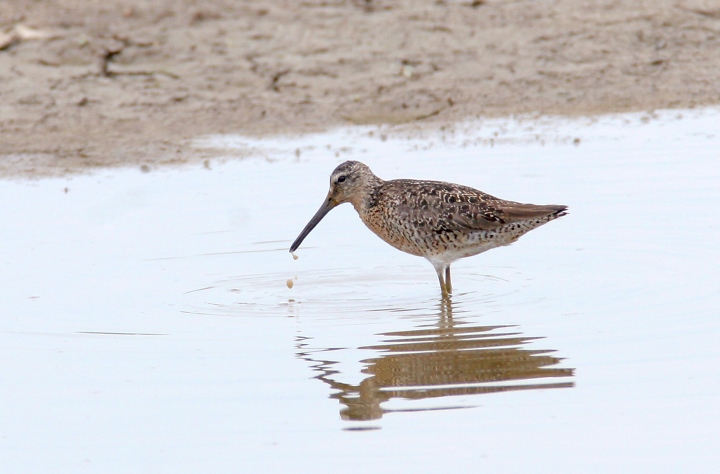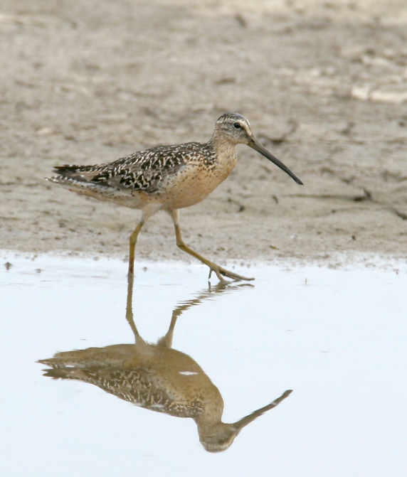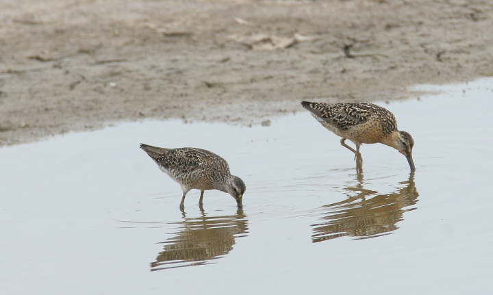 Below three: Short-billed Dowitchers foraging at Blackwater NWR, Dorchester Co., Maryland (7/29/2007). First image shows the Prairie subspecies, L. griseus hendersoni, while the second image shows the Atlantic subspecies, L. griseus griseus. In the third image, the hendersoni is on the right.