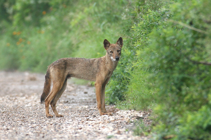 Below: Coyote or Coydog photographed in the late afternoon at Laguna Atascosa NWR, Texas (8/4/2007). At least to me, some of this canine's characteristics suggest a hybrid Coyote x Domestic Dog, or Coydog. My friend Kim Hafner also points out the short ears, overall color, and face shape. One might also argue that it contains some relictual Red Wolf blood. I'd love to hear anyone else's thoughts on it.