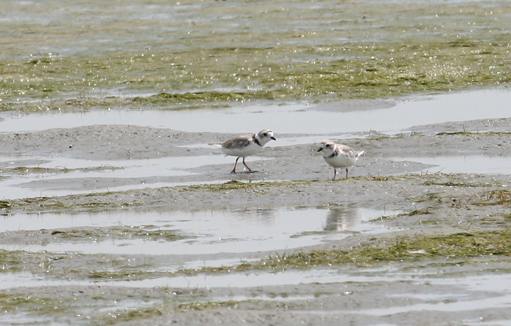 Below: Two Piping Plovers forage out on the flats of Laguna Madre, South Padre Island, Texas (8/4/2007). They're molting from breeding to nonbreeding plumage, but the yellowish orange legs simplify eliminating Snowy Plover from the ID.