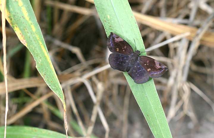 Below: A Sickle-winged Skipper poses just after dawn at Santa Ana NWR, Texas (8/5/2007). Note its hooked forewing tips after which it is named.