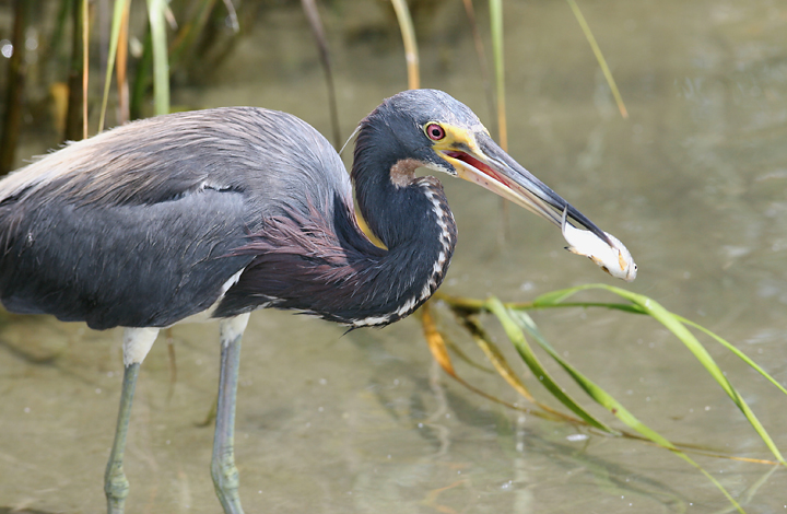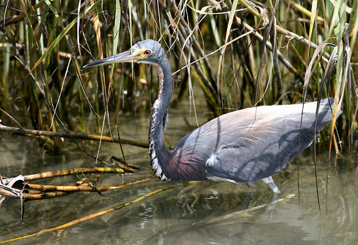 Below: A Tricolored Heron stalks ninja-like through the laguna-side grasses, South Padre Island, Texas (8/4/2007).