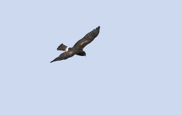 Below two: A fairly early migrant Northern Harrier. The characteristic shape of migrant harriers can be noted even at a distance. The dark head combined with an orange, unstreaked chest mark this bird as an immature. From above, a pale bar can be seen in the wings, and of course the white rump is always obvious. Photographed in P.G. Co., Maryland (9/14/2007).