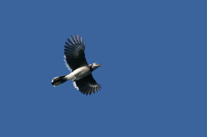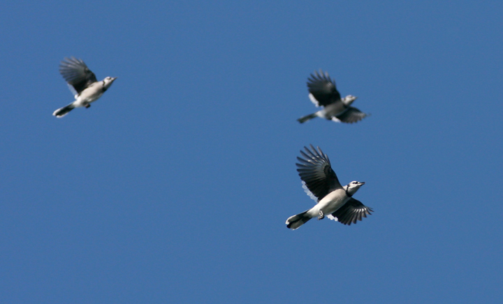 Below two: Several of the hundreds of migrant Blue Jays streaming past Turkey Point, Cecil Co., Maryland (9/23/2007). Note the white trailing edge on the secondaries.