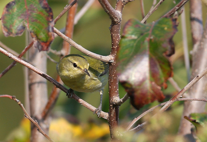 Below: A migrant Tennessee Warbler forages along the dunes at Point Lookout SP, St. Mary's Co., Maryland (10/7/2007).