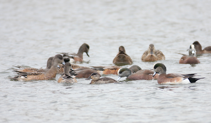 Below: Commensal feeding--the American Wigeon at this Worcester Co. pond were taking advantage of the aquatic vegetation being brought to the surface by the many diving birds such as American Coots, Ring-necked Ducks, and Ruddy Ducks.