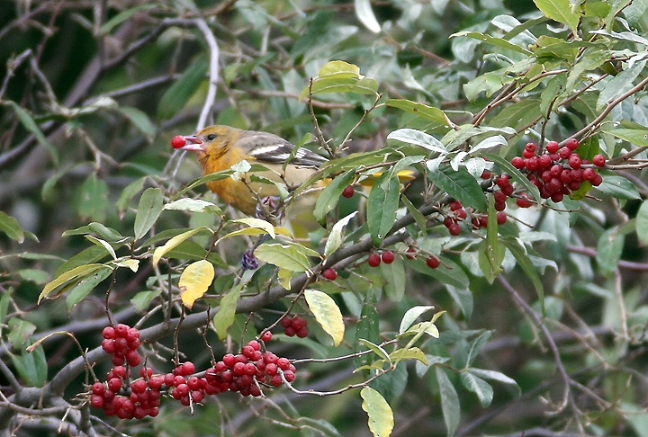 Below: A Baltimore Oriole feeding on Russian Olive north of Assateague Island (11/10/2007).