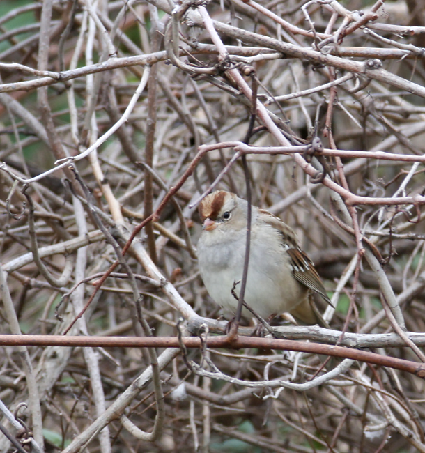 Below: Here's an Eastern White-crowned at the same location for comparison. Note especially the dark lore. This field mark stands out even more in most Eastern individuals. Note that the Gambel's doesn't have even a suggestion of dark in the lore.