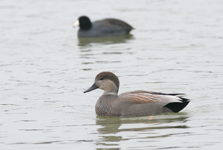 Below two: An adult drake Gadwall in coastal Worcester Co., Maryland (12/9/2007). American Coot in background.