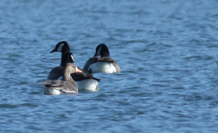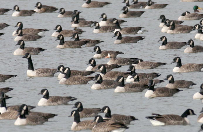 Below: A Greenland Greater White-fronted Goose playing 'Where's Waldo?' amidst a flock of Canada Geese in Frederick Co., Maryland (11/18/2007).