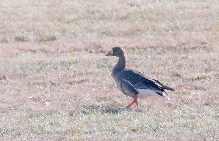 Above and below: Documentation photos of an inland subspecies Greater White-fronted Goose at Little Meadows Lake, Garrett Co., Maryland (12/2/2007). Most of our area's Greater White-fronted Goose records are of the flavirostris subspecies, which breeds in Greenland. Some of the key field marks for the Greenland population include an orange bill, dark head, and extensive dark speckling on the belly. Although there is still contention about this species' taxonomy, the latest data I've seen describes three "pink-billed" inland subspecies of Greater White-fronted Goose. These are less expected but possible on the East Coast: Tundra (frontalis), the Beaufort Sea population (gambelli), and Tule Goose (elgasi). The Tundra subspecies (frontalis) is the most expected of the inland subspecies in our area, but eliminating the other two is considered difficult. Tundra has the largest range and population size of the inland subspecies, and has been confirmed in a number of records along the East Coast. The nominate European subspecies (albifrons) is not expected in our area, but is similar to frontalis. According to Birds of North America On-line, there have been "no Nearctic band recoveries in Siberia, or Palearctic recoveries in North America." I can find no records of this subspecies in North America. The bill of the bird shown here is a bubblegum pink that really jumped out at us, contrasting strongly with the bird's bright orange legs. It was smaller and lighter than a Greenland bird, with relatively little speckling on the belly. This individual, which was found by Mikey Lutmerding, is one of the first documented records of an inland subspecies of Greater White-fronted Goose in Maryland. It's fascinating that the more expected visitors to our area are of the population that breeds in Greenland rather than Alaska and Canada. Additional comments are welcomed. Thanks to those who have commented already.
