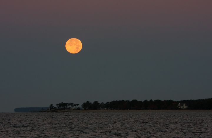 Below: The full moon hanging low at dawn as seen from Point Lookout, St. Mary's Co., Maryland (11/24/2007).