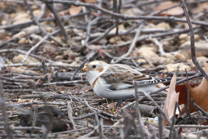 Below: A Snow Bunting feeding along Triadelphia Reservoir, Montgomery Co., Maryland (12/15/2007).