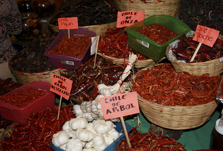 Below: A snapshot of the galaxy of chiles for sale in a Ciudad Oaxaca mercado.
