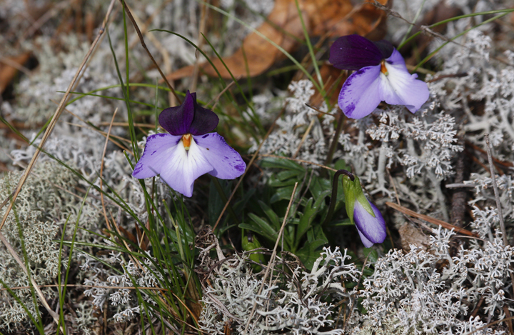 Below: Birdfoot Violets (Viola pedata) on a moss-covered slope in Green Ridge SF, Allegany Co., Maryland (4/19/2008).